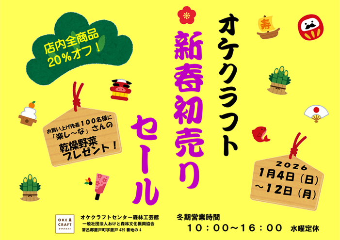 毎年ご好評をいただいておりますお正月のお楽しみ企画、「福袋」販売についてお知らせします。 お知らせが遅くなってしまい、申し訳ありません。 2026オケクラフト福袋につきましては、昨年同様、すべて予約販売といたします。ご予約方法は「ハガキでのご... 森林工芸館ショップだより