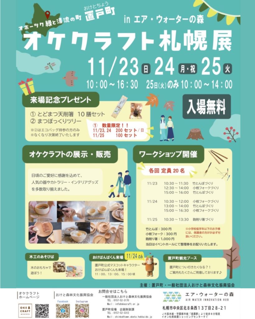 かねてより検討を進めていました「オケクラフト札幌展」。関係機関の皆様のご尽力により、11月23日から三日間開催する運びとなりました。今回は置戸町開町110周年記念事業と合わせての開催となります。 雪道になっているかもしれませんが、皆様、ぜひお越しくださいますようご案内申し上げます。